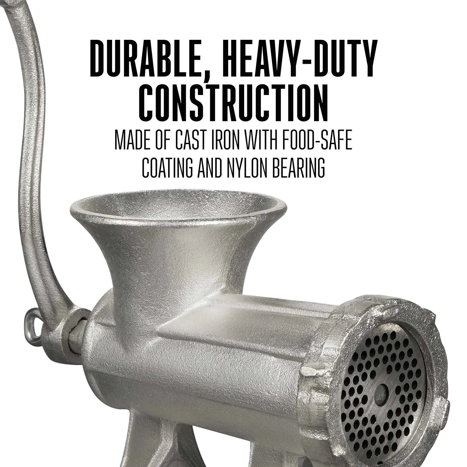 The manual meat grinder and sausage stuffer is made of cast iron with a food-safe tin coating for extra protection against wear and tear. The heavy-duty nylon bearing is built to last through years of use.