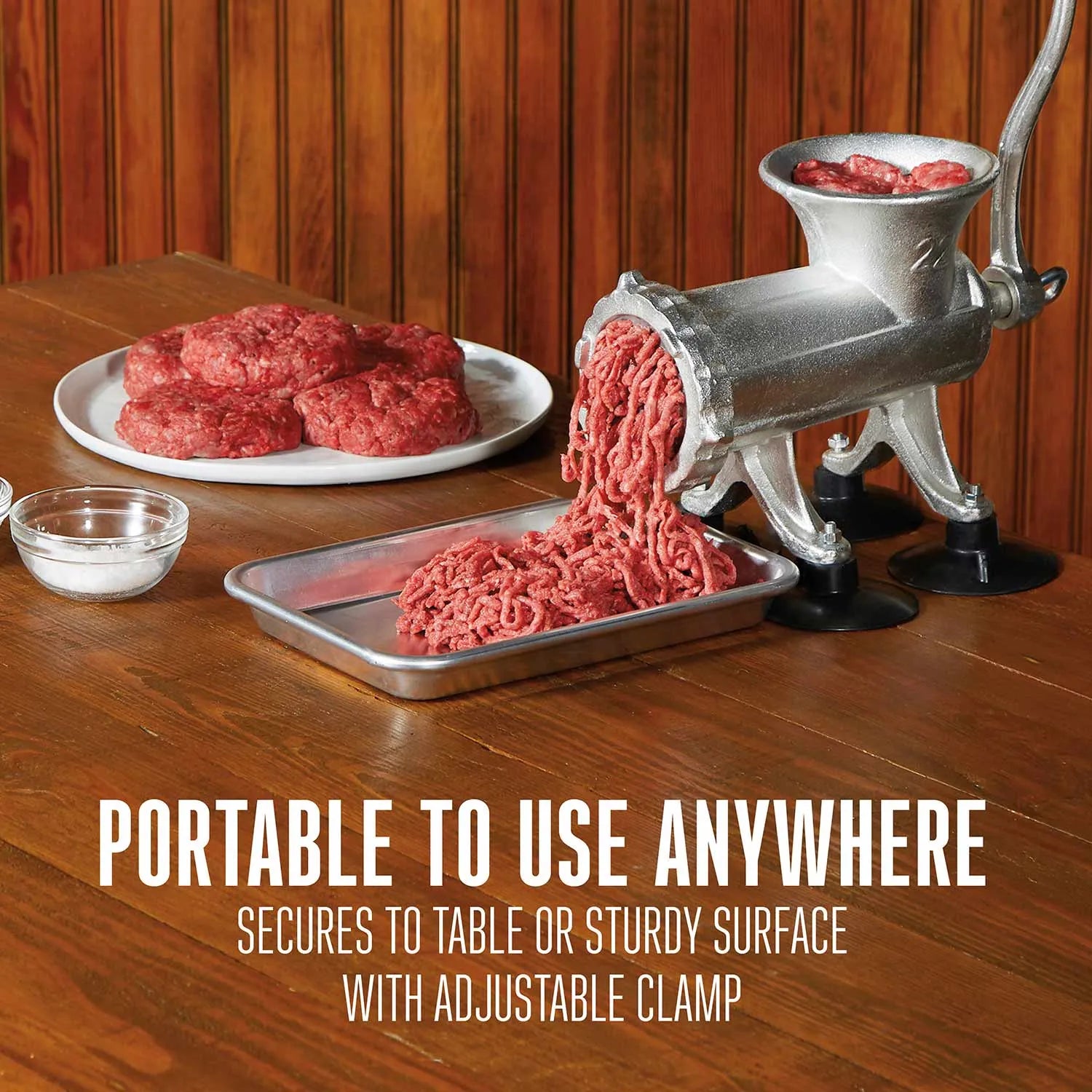 The manual meat grinder is portable to take into the field or woods with no electricity required. It has an adjustable clamp to securely attach to tables and other sturdy flat work surfaces.
