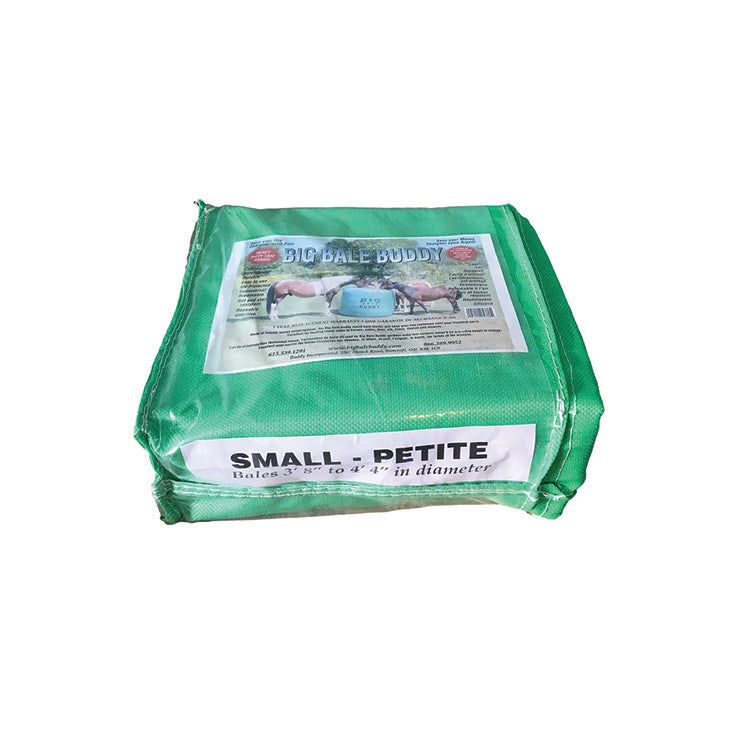 - Small: The small big Bale Buddy will hold a round bale up to 4 feet 4 inches in diameter. Made of heavy-duty, UV-protected open-weave polypropylene, it is long-lasting, strong, and lightweight. Safe and effective for all livestock. It helps to protect hay in windy and muddy conditions and minimizes waste, causing the round bale to last 1/3 longer. It can be turned on its side to help keep the bale dry in rainy conditions. It pays for itself many times over in saved hay.