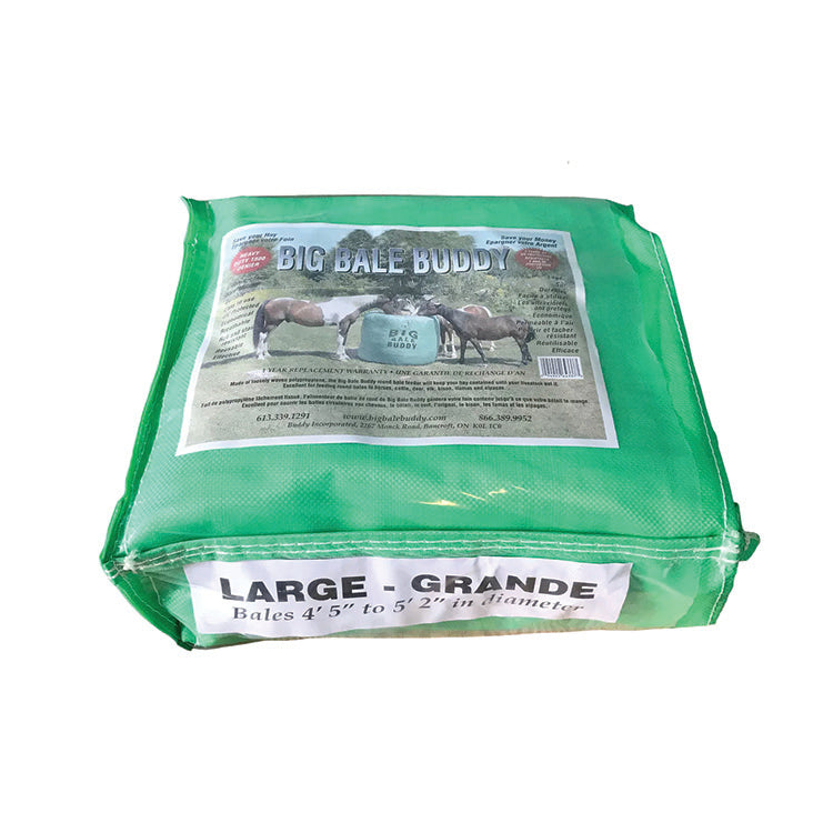 - Large: The large Big Bale Buddy will fit round bales from 4 feet 5 inches up to 5 feet 2 inches in diameter. Made of heavy-duty, UV-protected open-weave polypropylene, it is long-lasting, strong, and lightweight. Safe and effective for all livestock. Helps to protect hay in windy and muddy conditions and minimizes waste, causing the round bale to last 1/3 longer. Can be turned on its side to help keep the bale dry in rainy conditions. Pays for itself many times over in saved hay.