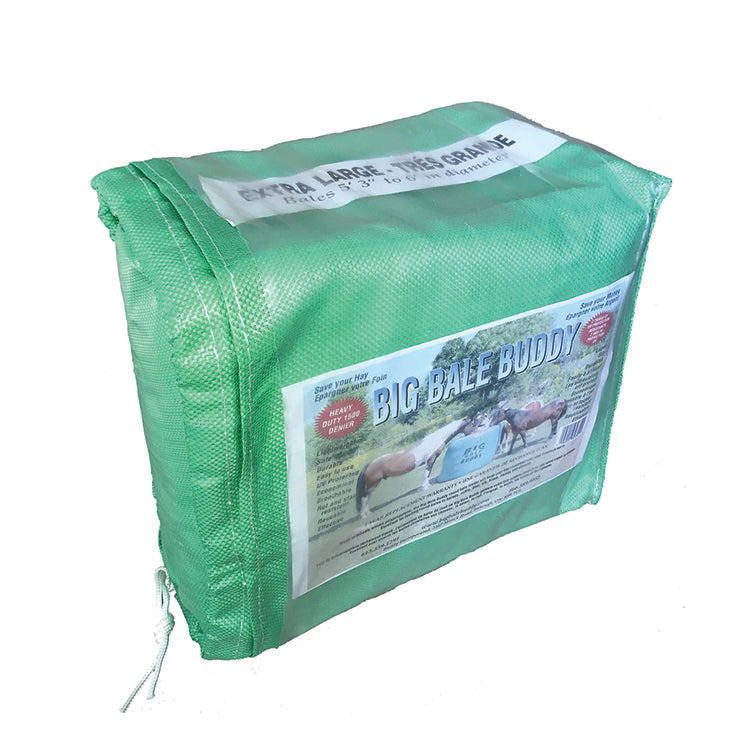 - Extra Large: Extra Large Big Bale Buddy for feeding round bales from 5 feet 3 inches up to 6 feet in diameter. Made of heavy-duty, UV-protected open-weave polypropylene, it is long-lasting, strong, and lightweight. Safe and effective for all livestock. Helps to protect hay in windy and muddy conditions and minimizes waste, causing the round bale to last 1/3 longer. Can be turned on its side to help keep the bale dry in rainy conditions. Pays for itself many times over in saved hay.