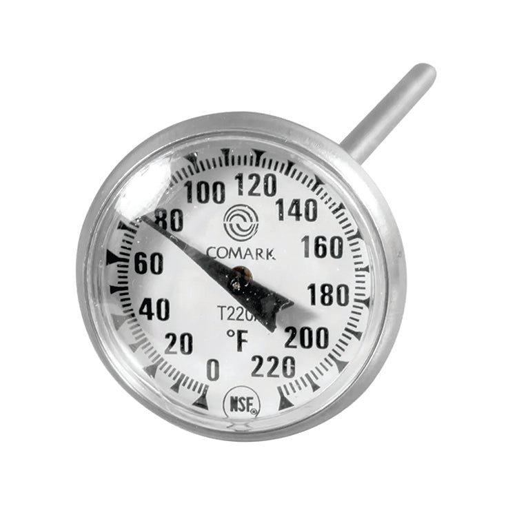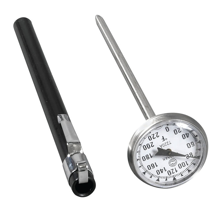 The Comark pocket thermometer measures 5 inches long with a 1-inch dial, so it's compact and lightweight for carrying in a jacket or apron pocket. It's designed to be water-resistant because it's made of stainless steel and has a tightly sealed, plastic lens that doesn't accumulate moisture during use. To keep the thermometer accurate and ensure the unit works correctly every time, users can adjust the calibration nut. This thermometer comes individually boxed.