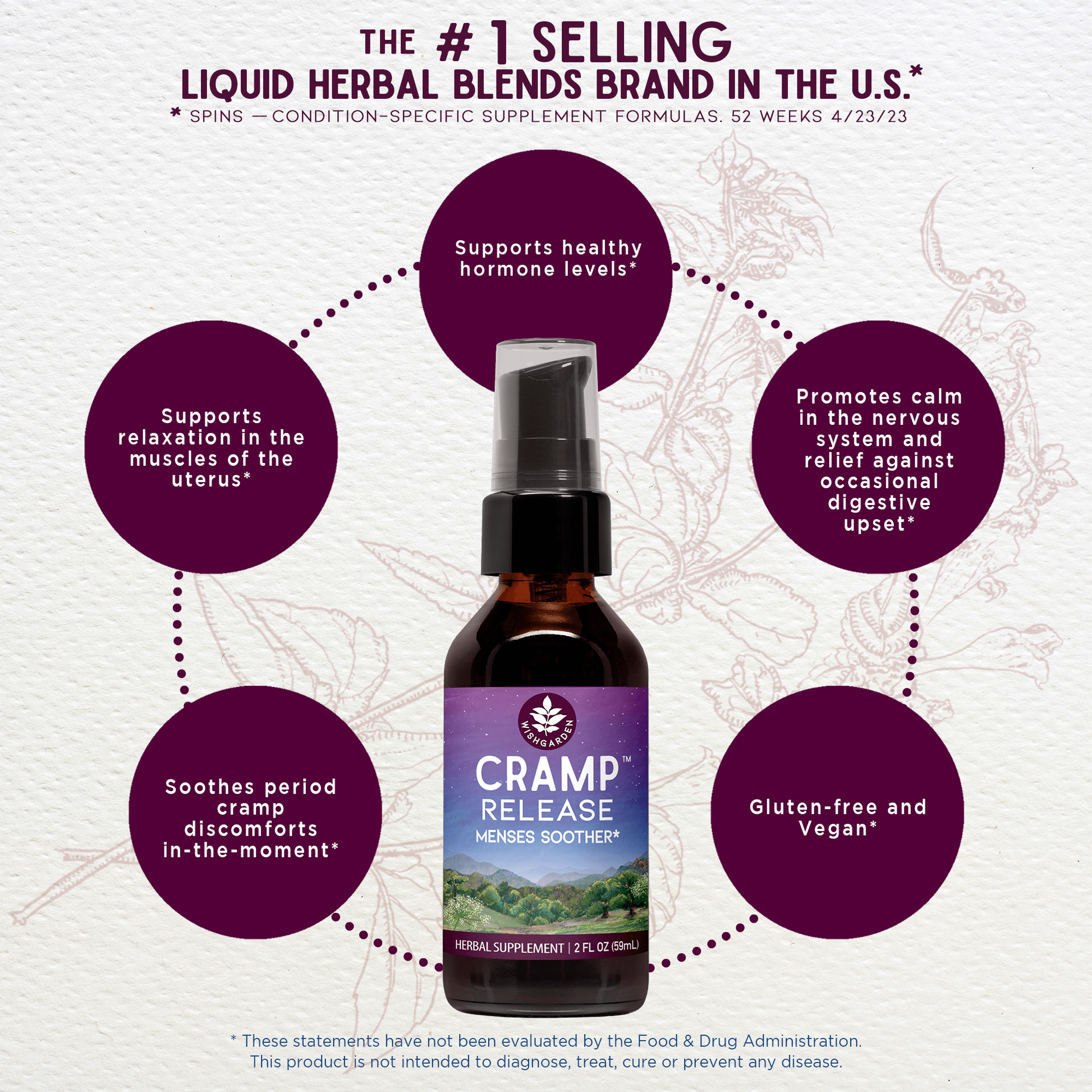 Cramp bark (Viburnum opulus), Black Cohosh root (Actaea racemosa (syn. Cimicifuga racemosa)), Wild Yam root (Dioscorea villosa), organic Catnip aerials (Nepeta cataria), organic Scullcap aerials (Scutellaria lateriflora), Black Haw bark (Viburnum prunifolium), vegetable glycerine, Rocky Mountain artesian spring water & organic gluten-free alcohol.