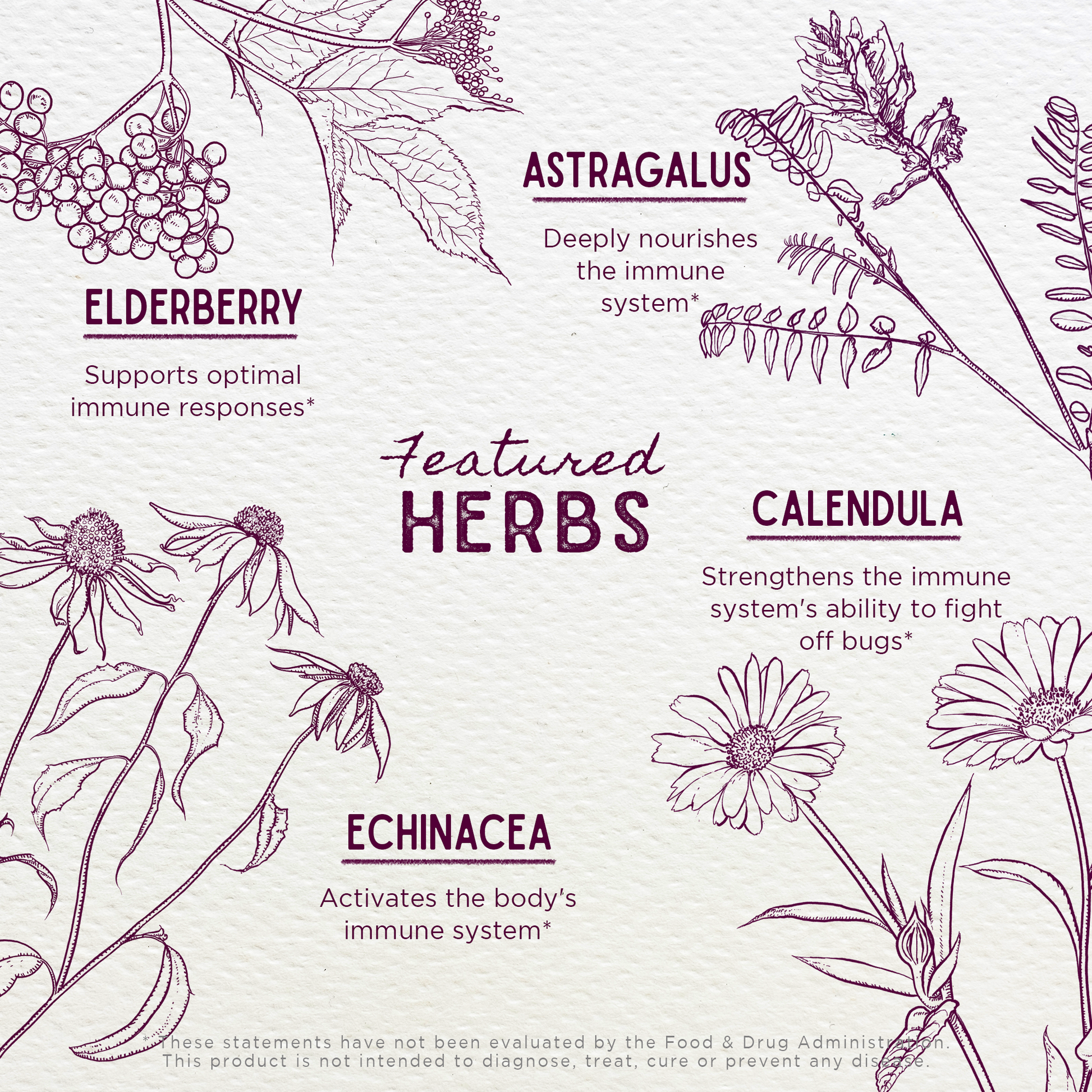 Organic Elderberry fruit (Sambucus nigra), organic Astragalus root (Astragalus membranaceus, A. mongholicus), organic Red Clover aerials (Trifolium Pratense), organic Echinacea purpurea root (Echinacea purpurea), organic Calendula flower (Calendula officinalis), organic Marshmallow root (Althaea officinalis), vegetable glycerine, Rocky Mountain artesian spring water & organic gluten-free alcohol.