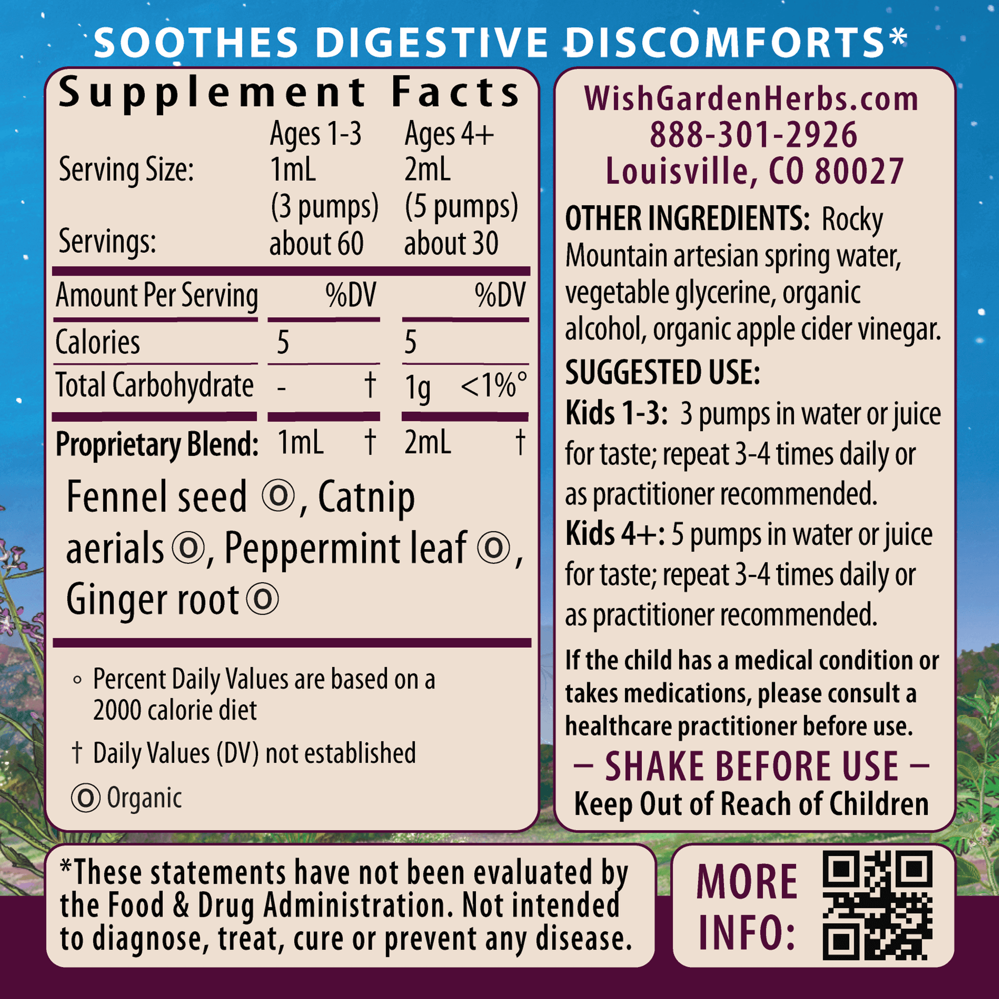 Organic Fennel seed (Foeniculum vulgare), organic Catnip aerials (Nepeta cataria), organic Peppermint leaf (Mentha piperita), organic Ginger root (Zingiber officinale), Rocky Mountain artesian spring water, vegetable glycerine, organic gluten-free alcohol & organic apple cider vinegar.