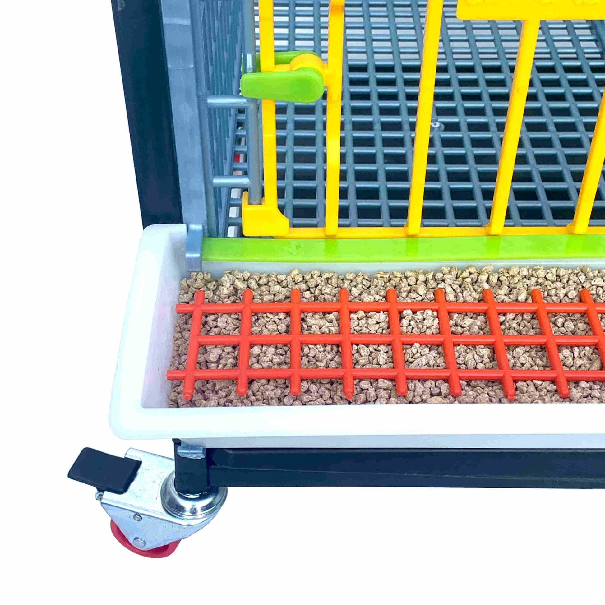 Shock-proof, red grills lay on top of removable feeding troughs to reduce feed loss, inside and outside the cage. Removable feeding troughs holds 6.5 pounds of feed. Customers claim to save 30% more of their feed with the flexible, shock-proof grills.