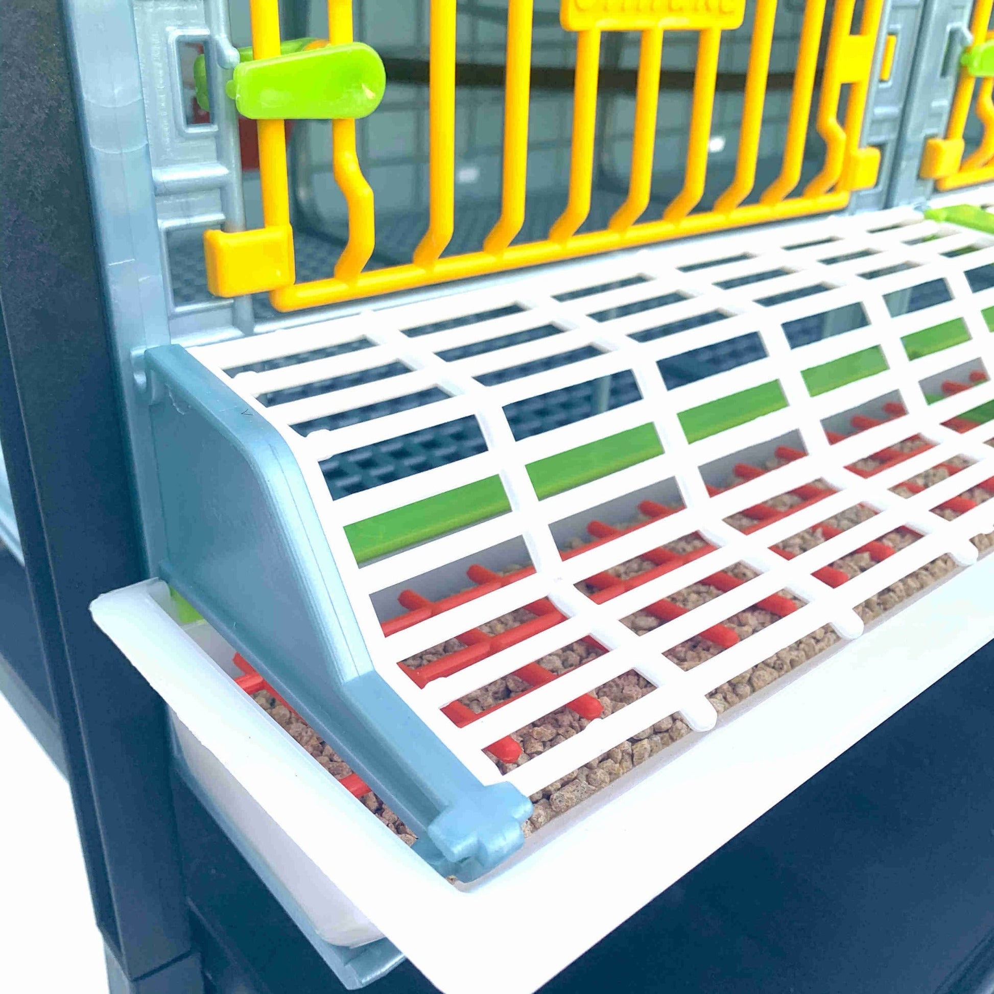 Shock-proof, red grills lay on top of removable feeding troughs to reduce feed loss, inside and outside the cage. Removable feeding troughs hold 5 pounds of feed. Customers claim to save 30% more of their feed with the flexible, shock-proof grills.