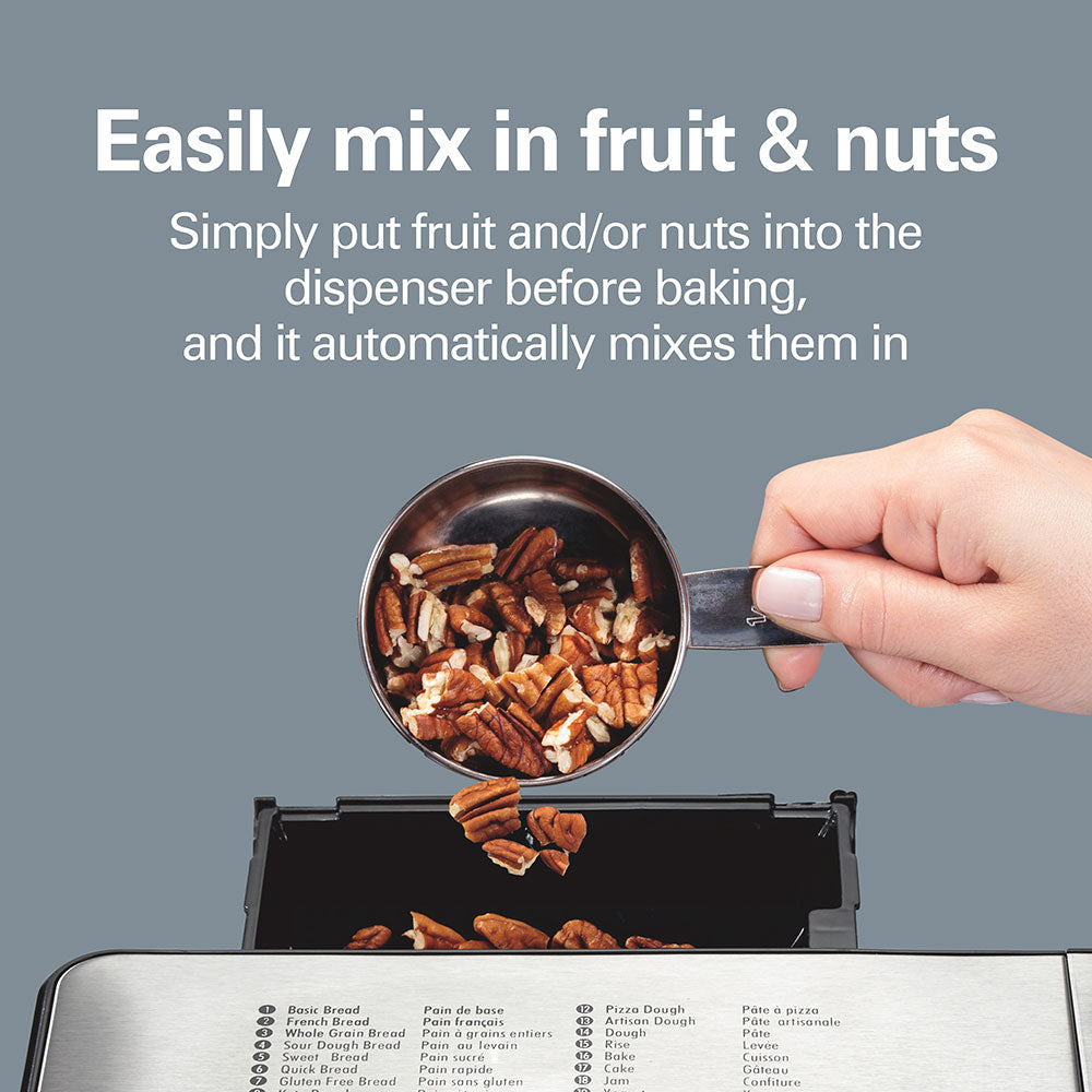 After you add your mix-ins to the automatic fruit and nut dispenser, the bread maker combines them with the dough at the ideal part of the kneading process for easy, hands-off bread-making.