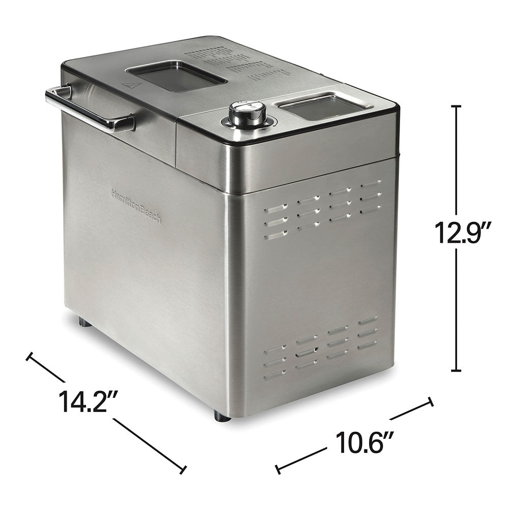 The Hamilton Beach® Premium Bread Maker lets you easily prepare homemade breads, doughs and more with minimal effort. Do you like the added nutrition and flavor of bread that has fruit or nuts mixed in? You'll love the automatic fruit and nut dispenser. Simply put fruit and/or nuts into the dispenser before baking, and it automatically mixes them in at the ideal part of the kneading process. You'll be pleased with all the delicious things you can make with the Hamilton Beach Premium Bread Maker and it's easy to use. There are just 3 simple steps: add ingredients, select cycle and press start.