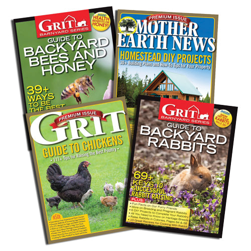 The Homestead Resource Set includes GRIT Guide to Backyard Bees and Honey, Mother Earth News Premium: Homestead DIY Projects, GRIT Premium: Guide to Chickens, and GRIT Guide to Backyard Rabbits. Being able to creatively solve problems and embrace a DIY culture is a big part of homesteading, and the articles and information found in these four special issues will prove their worth time and time again.