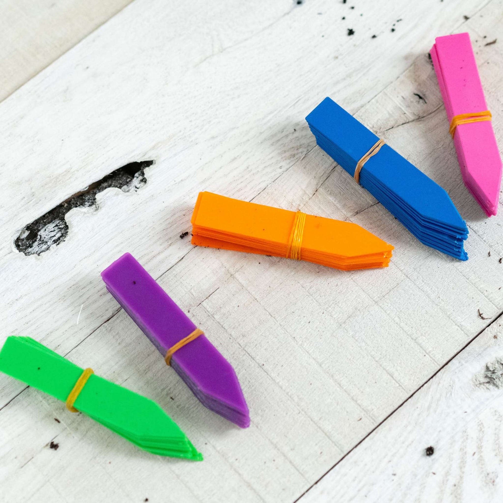 Bring a burst of color to your gardening chores with our 100-count of durable plant labels! Available in a vibrant assortment of pink, blue, purple, orange, and green, these labels are perfect for organizing and identifying your plants with ease. Each label measures 4 inches in length, 11/16 inches in width, and is 1/32 inches thick, providing ample space for writing while remaining sturdy and easy to insert into soil. Ideal for both indoor and outdoor use, these labels are designed to withstand the elements and last throughout the growing season.