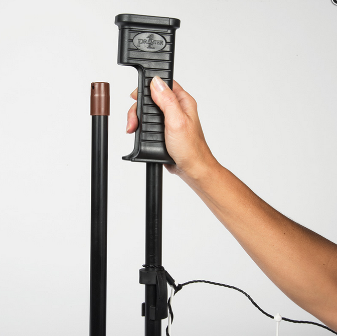 Quickly installs at the ends of existing garden or poultry fences. Gate post locks into place via a handle and docking station. Stainless steel clips at each end of the gate provide electrical connections to the fence. Features drivable posts which are useful in dry, hard or rocky soils.