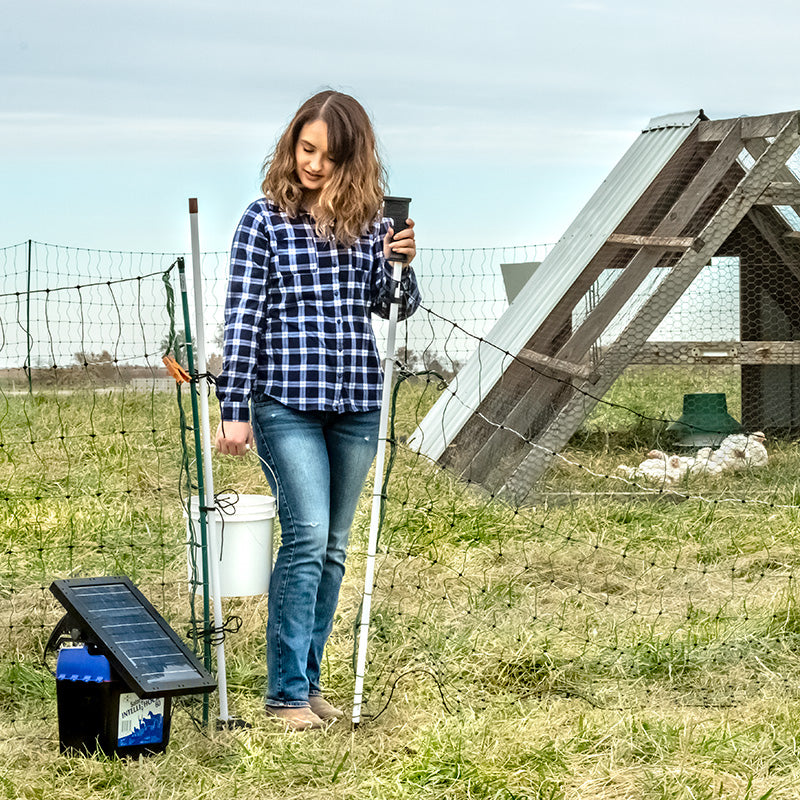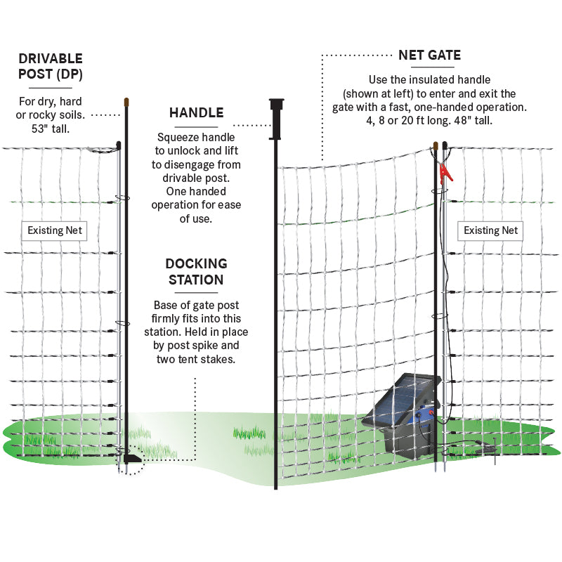 The PoultryNet Gate provides easy access in and out of netting enclosures without the need to turn off a fence energizer. It quickly installs at the ends of your garden fences or poultry fences with drivable posts, which are useful in dry, hard, or rocky soils. With a gate that locks into place via a handle and docking station and stainless steel clips at each end of the gate that provides electrical connections to the fence, this is the perfect gate to add to your existing garden or poultry fences!