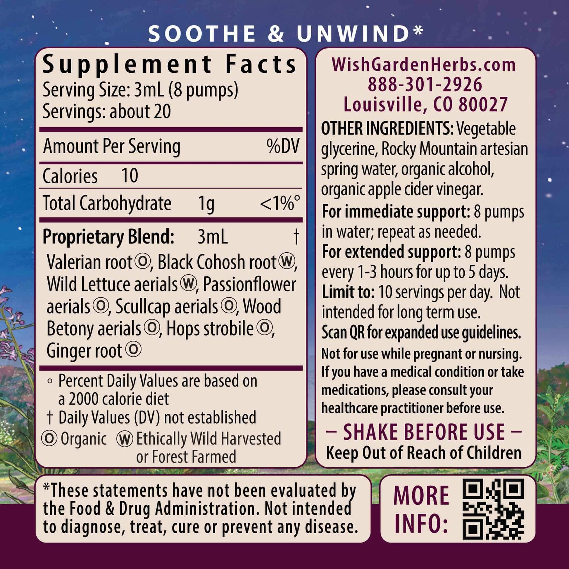 Organic Valerian root (Valeriana officinalis), Black Cohosh root (Actaea racemosa (syn. Cimicifuga racemosa)), Wild Lettuce aerials (Lactuca virosa, L. serriola, L. quercina, L. canadensis), organic Passionflower aerials (Passiflora incarnata), organic Scullcap aerials (Scutellaria lateriflora), organic Wood Betony aerials (European) (Stachys officinalis), organic Hops strobiles (Humulus lupulus), organic Ginger root (Zingiber officinale), vegetable glycerine, Rocky Mountain artesian spring water, organic gluten-free alcohol & organic apple cider vinegar.