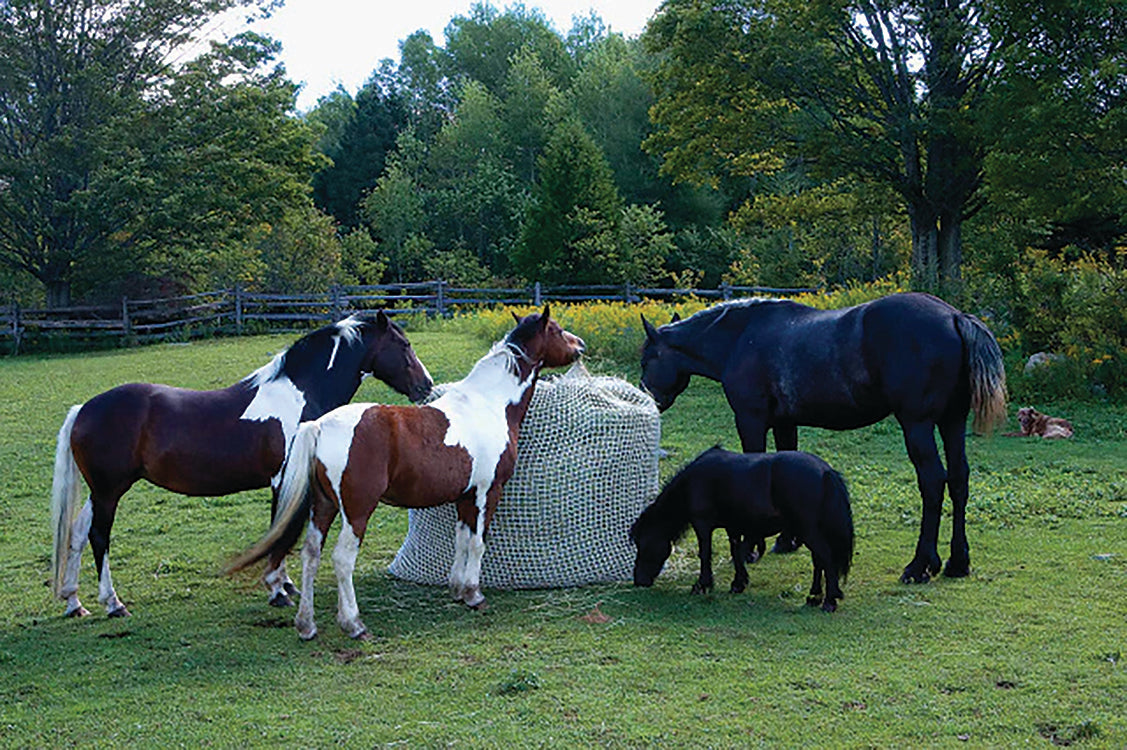 The Slow Bale Buddy is the safest, best-quality small mesh hay feeder on the market today. The only one with a one-year warranty, it is the perfect solution for feeding horses round and square bales of all sizes. Waste is completely eliminated, and aggressive and anxious animals are calmed by having to graze and forage for their hay. Overweight animals will walk away from the hay without overeating, helping to normalize weight. Because grazing is always on the surface of the bale, it is excellent for feeding horses with breathing problems. Slow feeding benefits most animals and is the most natural way to feed hay.