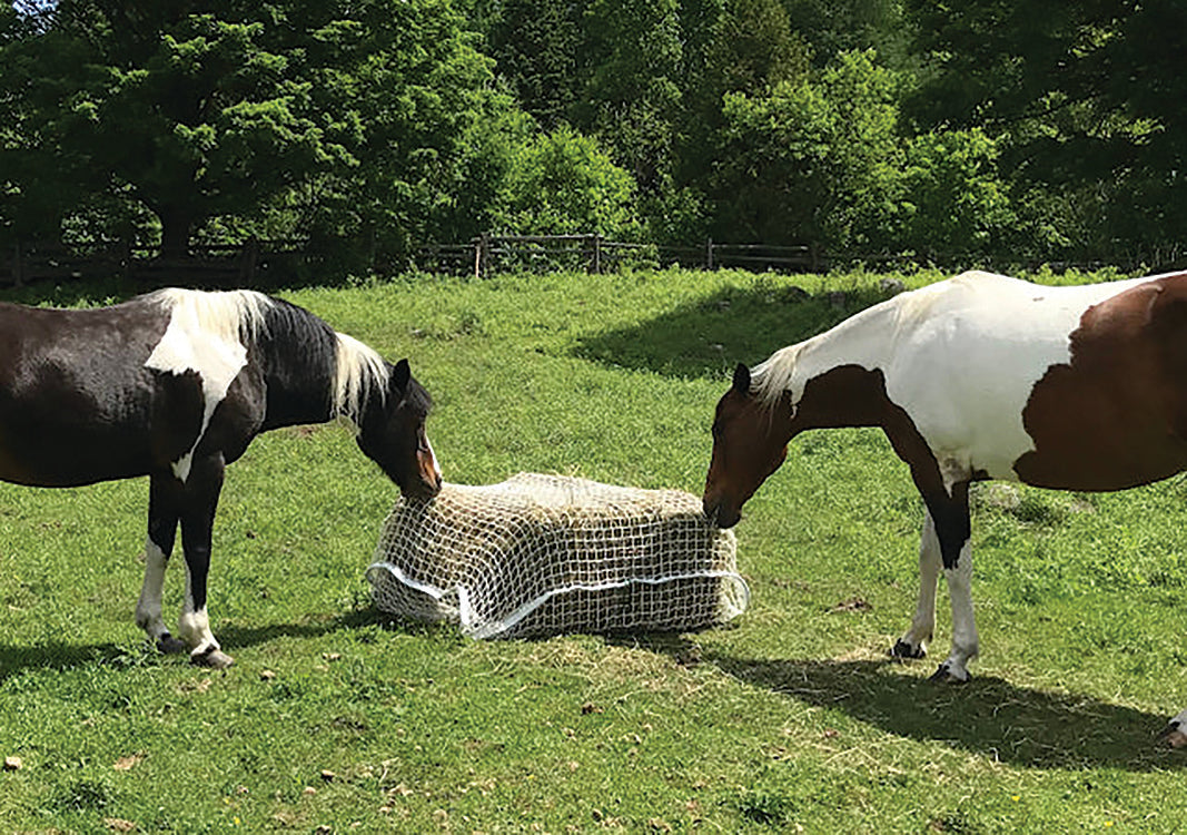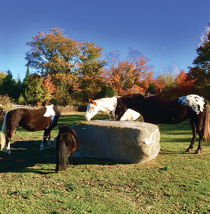 When using your Slow Bale Buddy for the first time, it is a good idea to pull hay through the netting in a few spots around the bale to help your horses understand that the hay must be pulled through the net to be eaten. They will learn quickly and be pros by the time the first bale is gone. The horse owner will be very pleased because all the hay purchased or harvested will be consumed, saving money, effort, and time. The horses are happy because they have a constant source of hay they can nibble and graze on in the way nature intended. Their minds are occupied, and their stomachs are soothed by the continuous slow supply of food that their digestive system needs to function optimally.