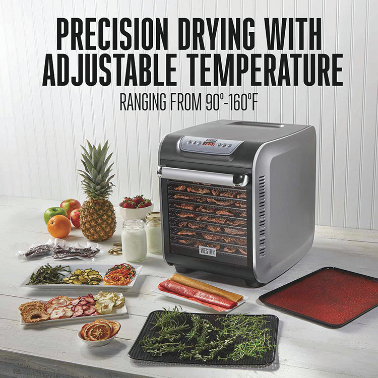 The Weston® 10-Tray Digital Food Dehydrator with Oven-Style Door has up to 10.3 sq. ft. of drying space for making pounds of delicious healthy snacks and preserving more food at once. This innovative food dehydrator is perfect for precision drying with fully adjustable temperatures from 90º to 160º F. You can dry a broad range of foods at the ideal temperature, including herbs, jerky, fruit leather, kale chips, and more, without extra sugar or additives.