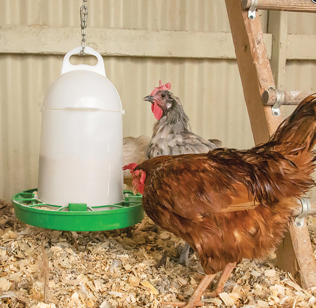 - Unique hinged lid opens to allow poultry keepers to top-off the feed without the need to flip over the feeder.
