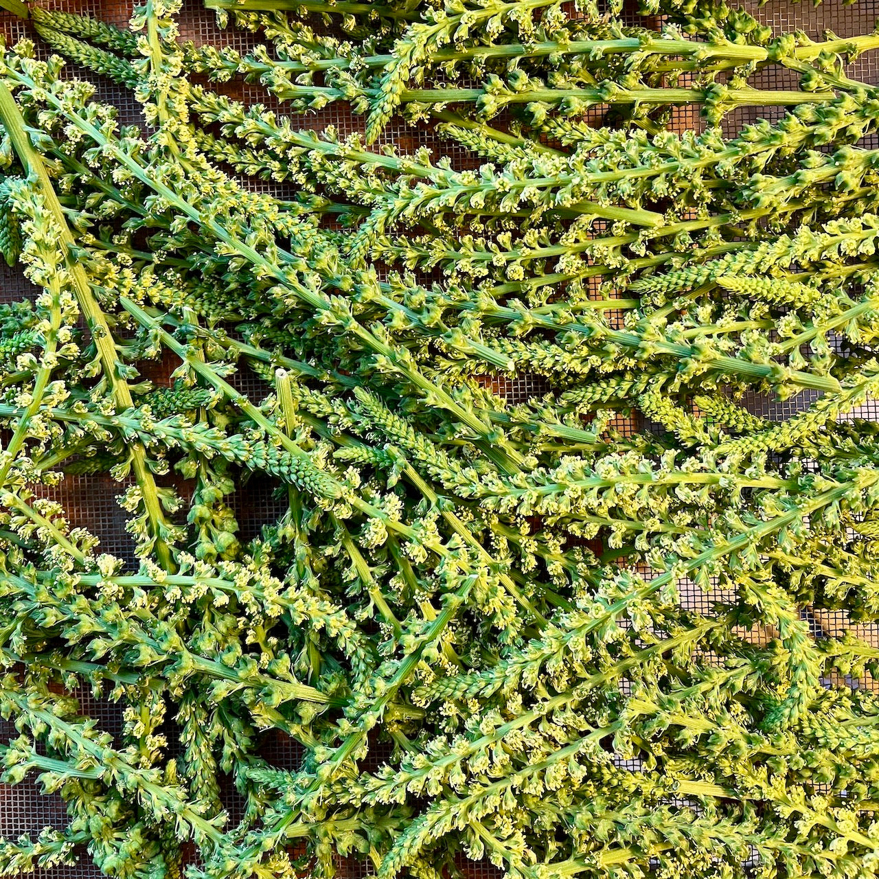 Weld is a biennial natural dye plant used to make a bright yellow dye (shown on wool in the second photo). The candle-shaped flowering stalks for dye are harvested in the second year. A pollinator favorite, the second-year blossoms smell deliciously fragrant!
