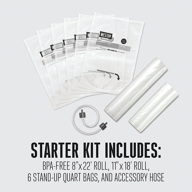 - The starter kit includes an 8" x 22' roll, 11" x 18' roll, 6 Weston Stand-Up Quart Bags, and an accessory hose. The smooth touchpad is easy to clean.
